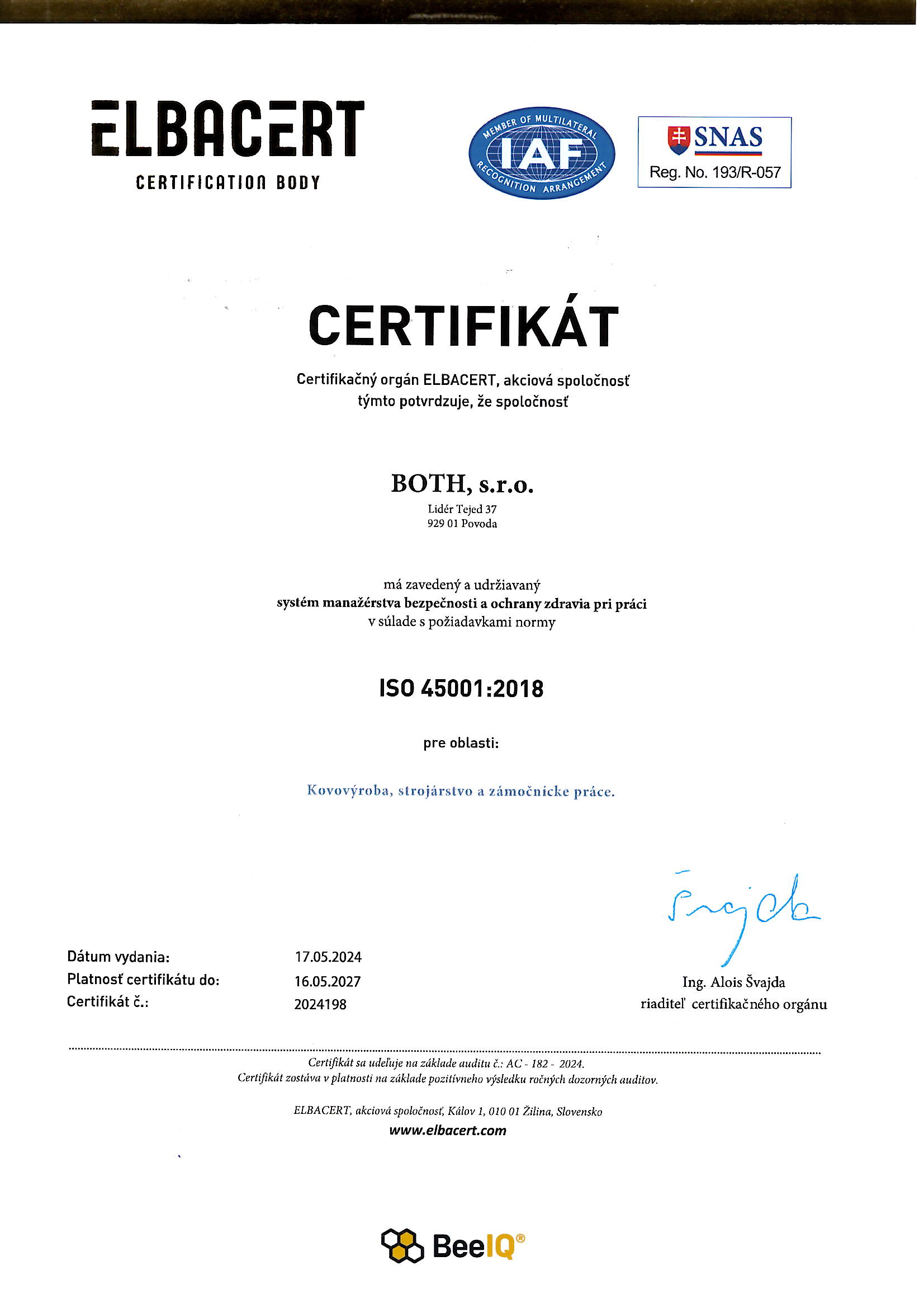 - ISO 45001:2018 na ochranu bezpečnosti a zdravia pracujúcich