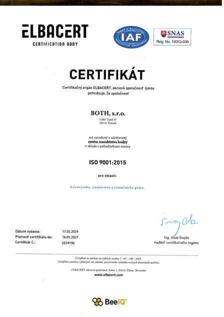 V záujme zachovania spokojnosti a dôvery našich klientov, resp. získanie nových a pre zabezpečenie zvýšenia kvality činnosti, v roku 2019 bol zavedený systém riadenia kvality podľa ISO 9001:2015.