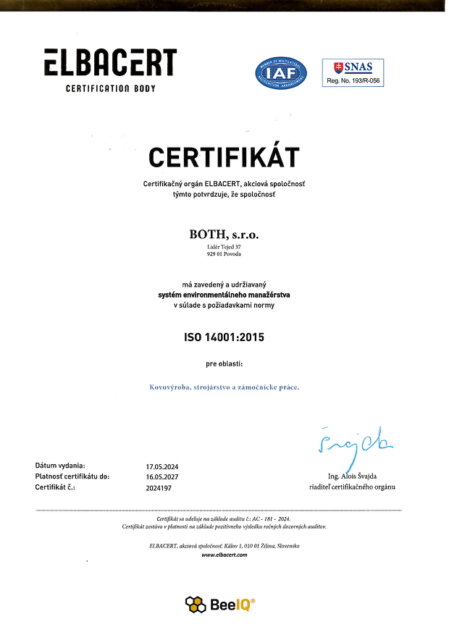 - ISO 14001:2015 na ochranu životného prostredia a